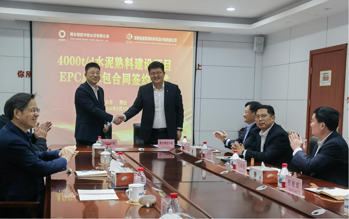 2026年2月5日,湖南省建筑材料研究設(shè)計院有限公司HNBMI董事長晉欣然攜副總經(jīng)理兼總工程師吳春宏一行,赴山東煙臺與煙臺棲霞中聯(lián)水泥有限公司黨支部書記、副總經(jīng)理(主持工作)任相琛等相關(guān)負責人齊聚一堂,共同出席煙臺棲霞中聯(lián)水泥有限公司4000t/d水泥熟料建設(shè)項目EPC總承包合同簽約儀式,雙方正式完成合同簽署。此次簽約不僅為雙方新春伊始的深度合作奠定了堅實基礎(chǔ),更為HNBMI沖刺2026年業(yè)務(wù)“首季開門紅”注入了強勁發(fā)展動能。